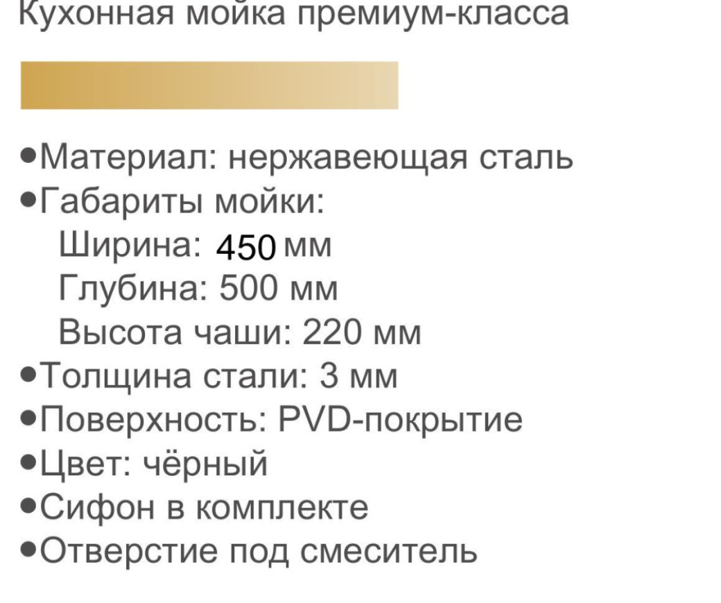 Мойка изготавливается с двумя отверстиями. Одно отверстие под смеситель, второе можно изспользовать для установки крана для питьевой воды, либо для дозатора под моющее средство (тем самым позволяет сэкономить пространство около мойки). Гарантия на коррозийную стойкость изделия - 5 лет. Гарантия на устойчивость PVD-покрытия - 2 года. Гарантия на комплектующие к изделию (сифон, гибкий шланг для подключения к канализации, выпуск с корзиной) - 1 год. |
